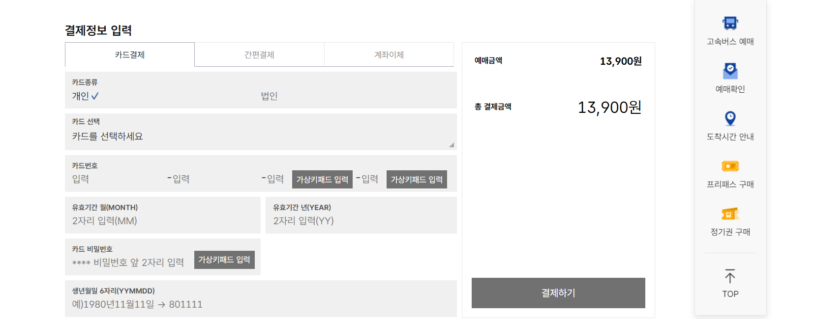 카드정보를 입력하여 예매를 완료합니다