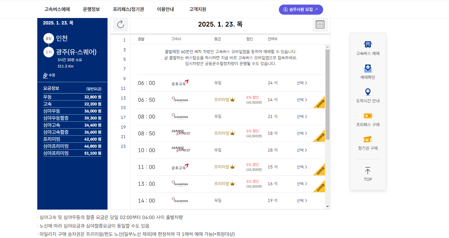 각 노선별로 일반, 우등, 프리미엄 등 다양한 등급의 버스가 운행되고 있어 여행자의 선호에 따라 선택할 수 있습니다