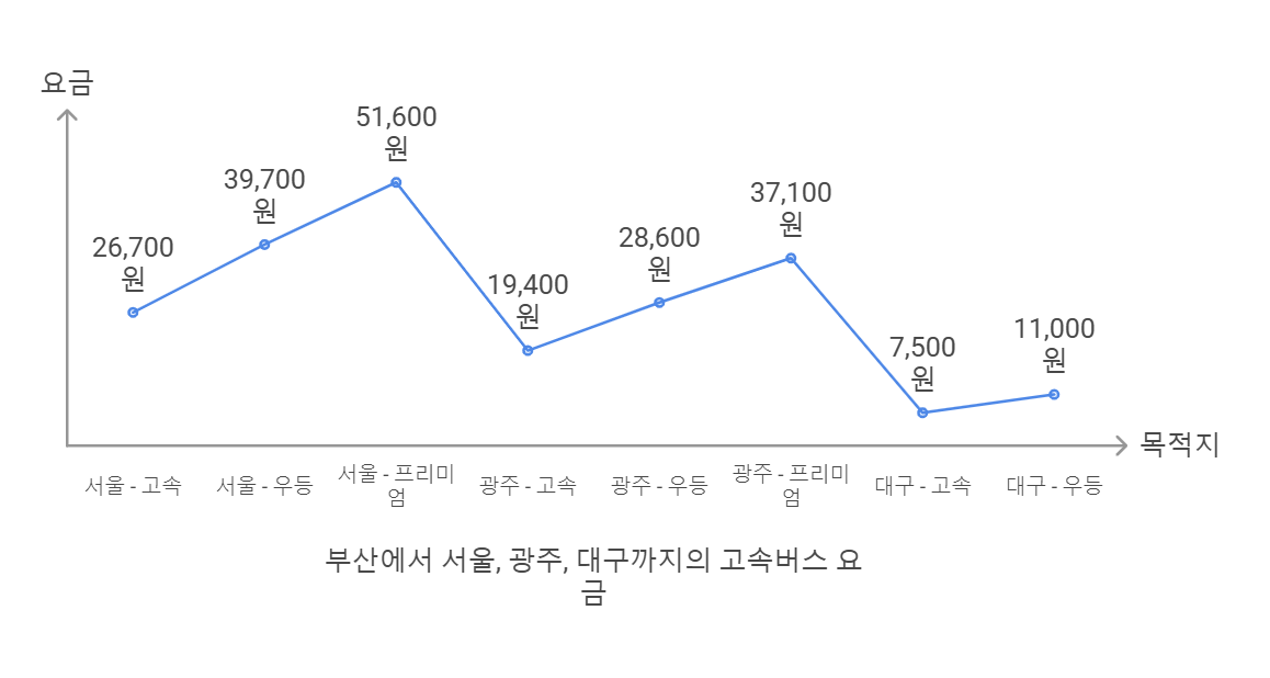 부산-서울: 고속 26,700원, 우등 39,700원, 프리미엄 51,600원