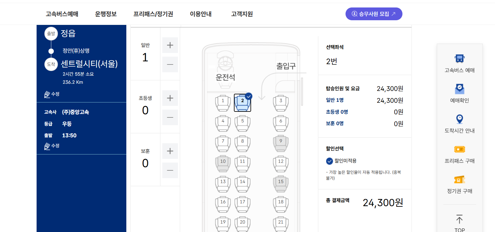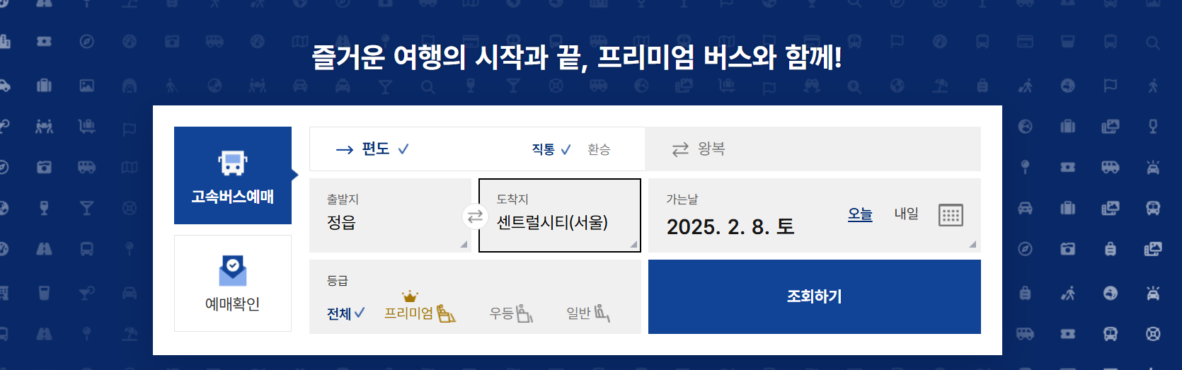 로그인 후, 홈페이지에서 출발지를 '정읍'으로, 도착지를 '서울경부'로 선택합니다