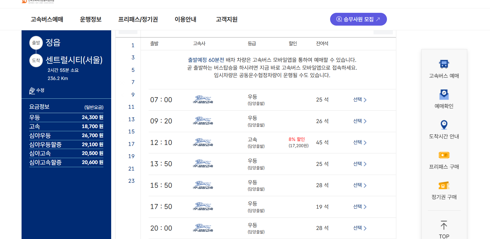 사용 가능한 좌석과 버스 유형(일반, 우등 등)을 확인하고, 원하는 좌석을 선택합니다. 버스 내부의 좌석 배치도를 볼 수 있어 창가 자리 나 복도 자리 등 선호하는 좌석을 고를 수 있답니다