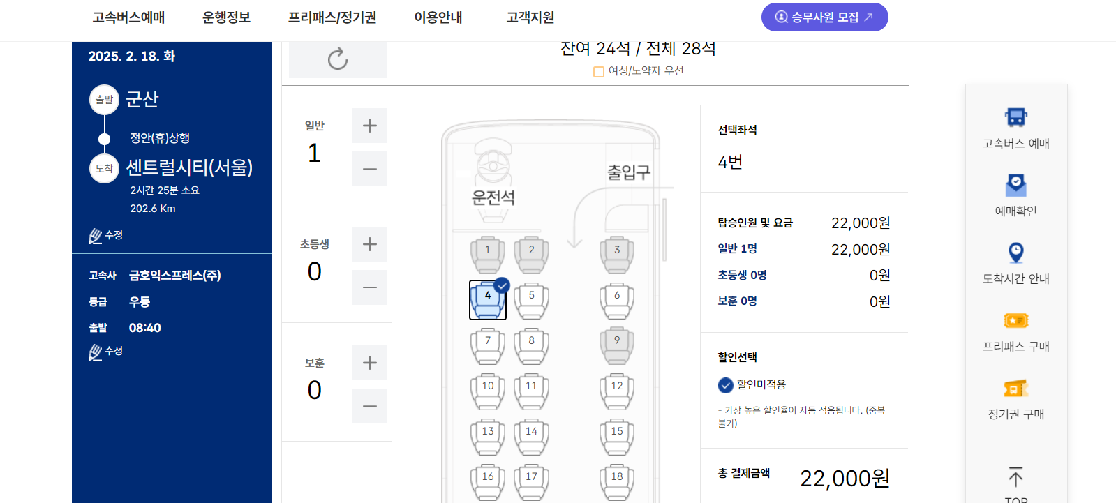 인원수를 입력하고 좌석을 선택합니다