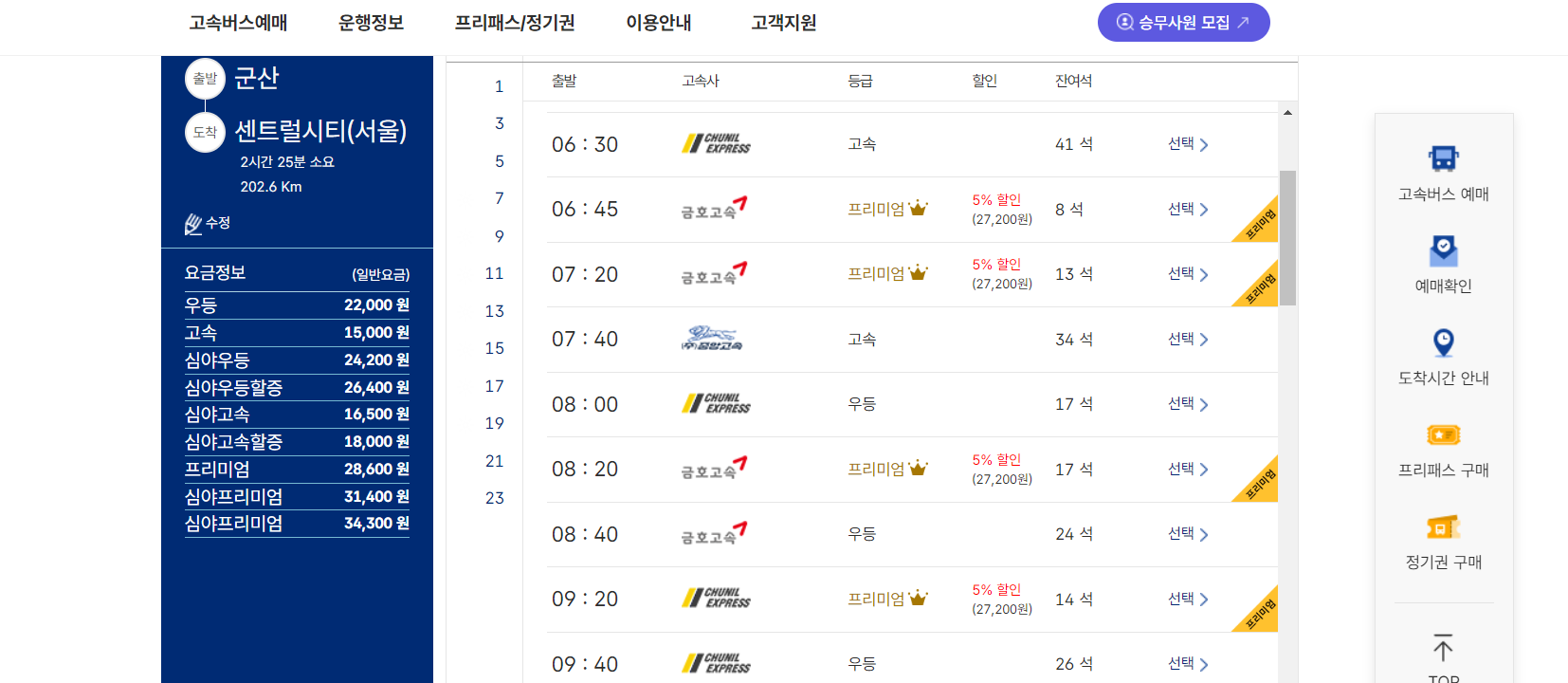 온라인 예매 사이트: 고속버스통합예매 사이트에서 실시간으로 확인 가능