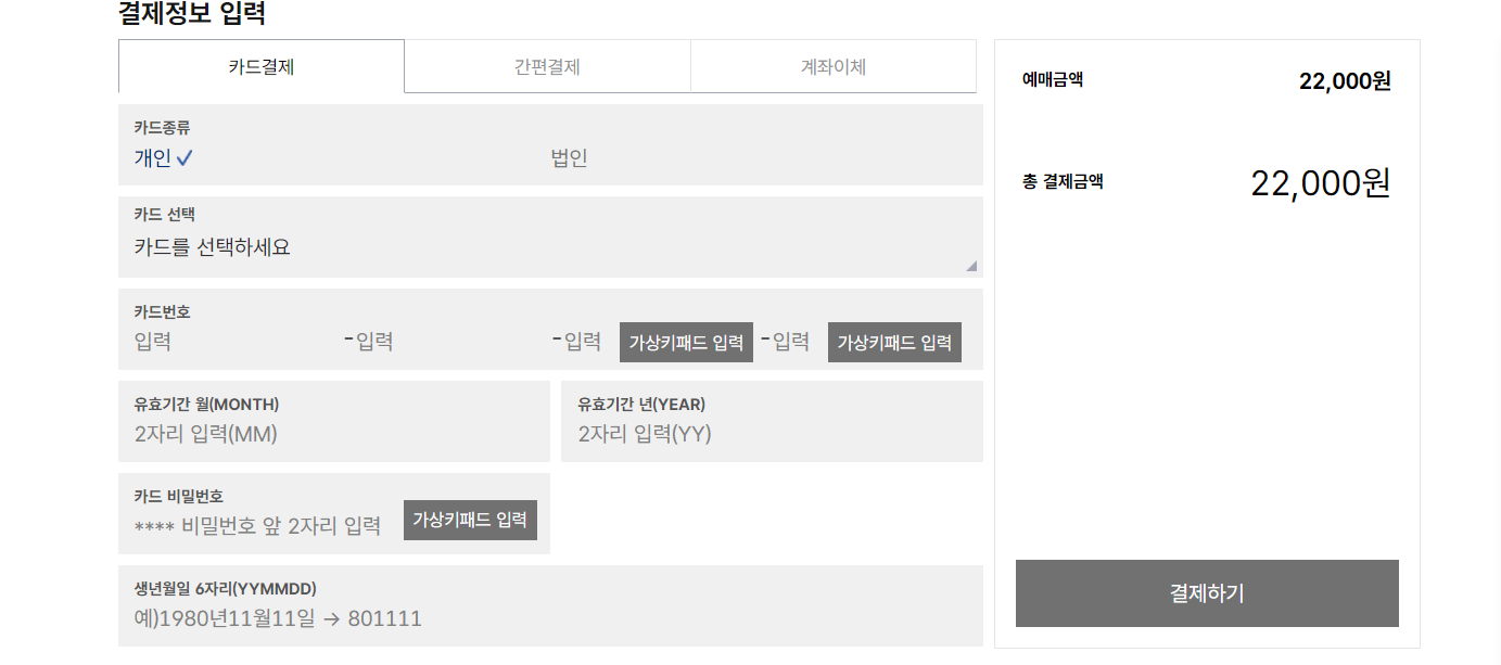 결제정보를 입력하여 예매를 완료합니다