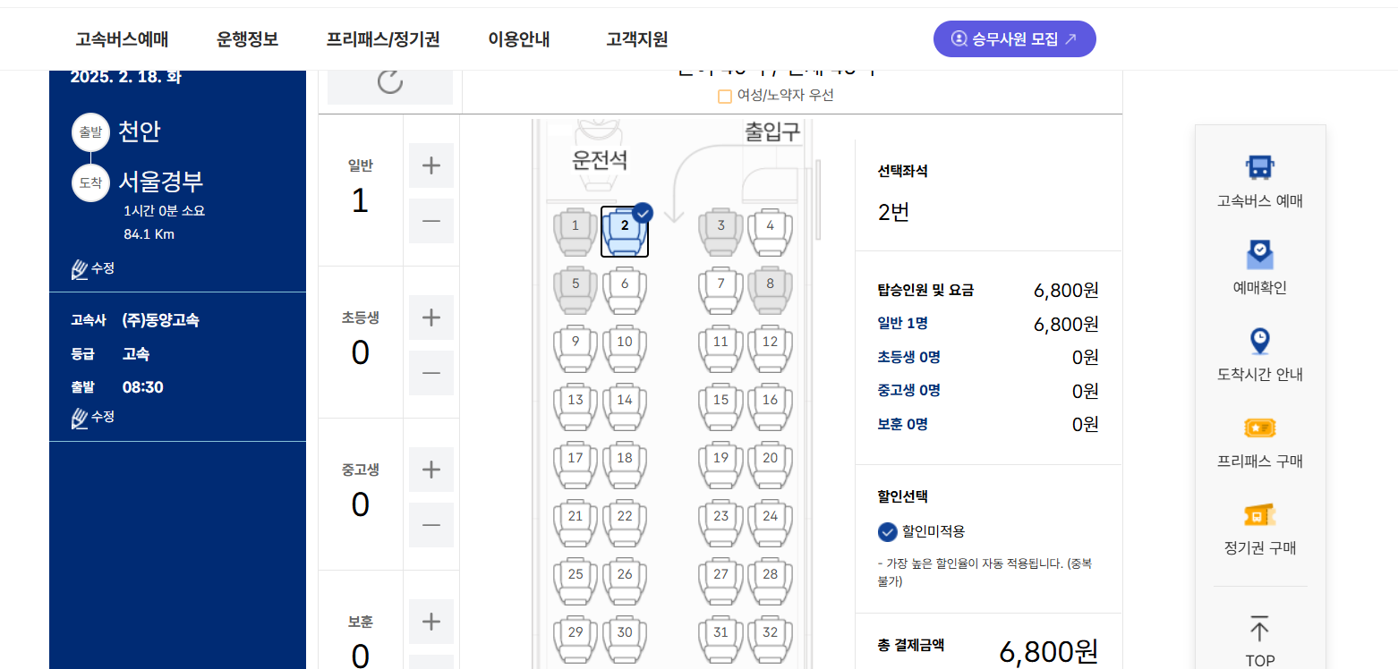 원하는 버스 시간 및 좌석 선택