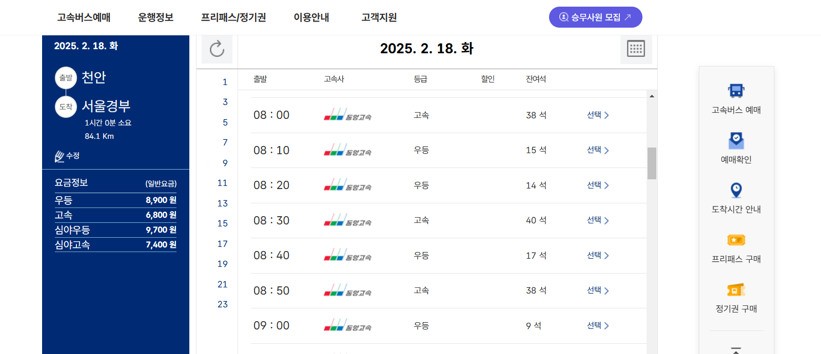 출발지(천안)와 도착지, 탑승 날짜 입력 후 조회