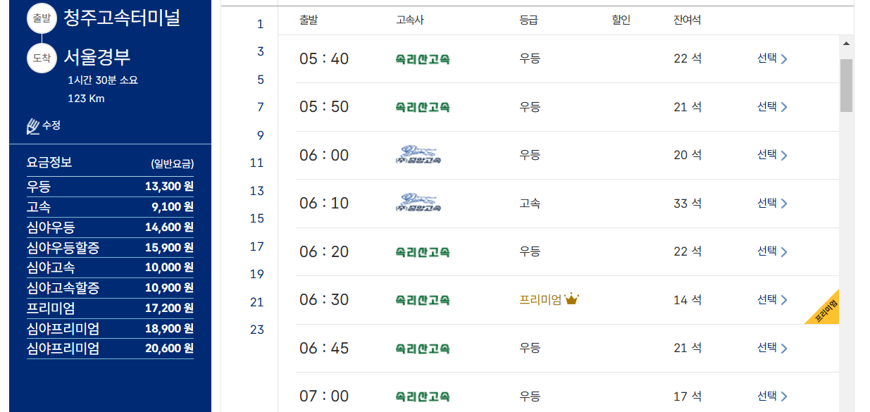 우등: 넓은 좌석, TV 등 추가 편의 시설